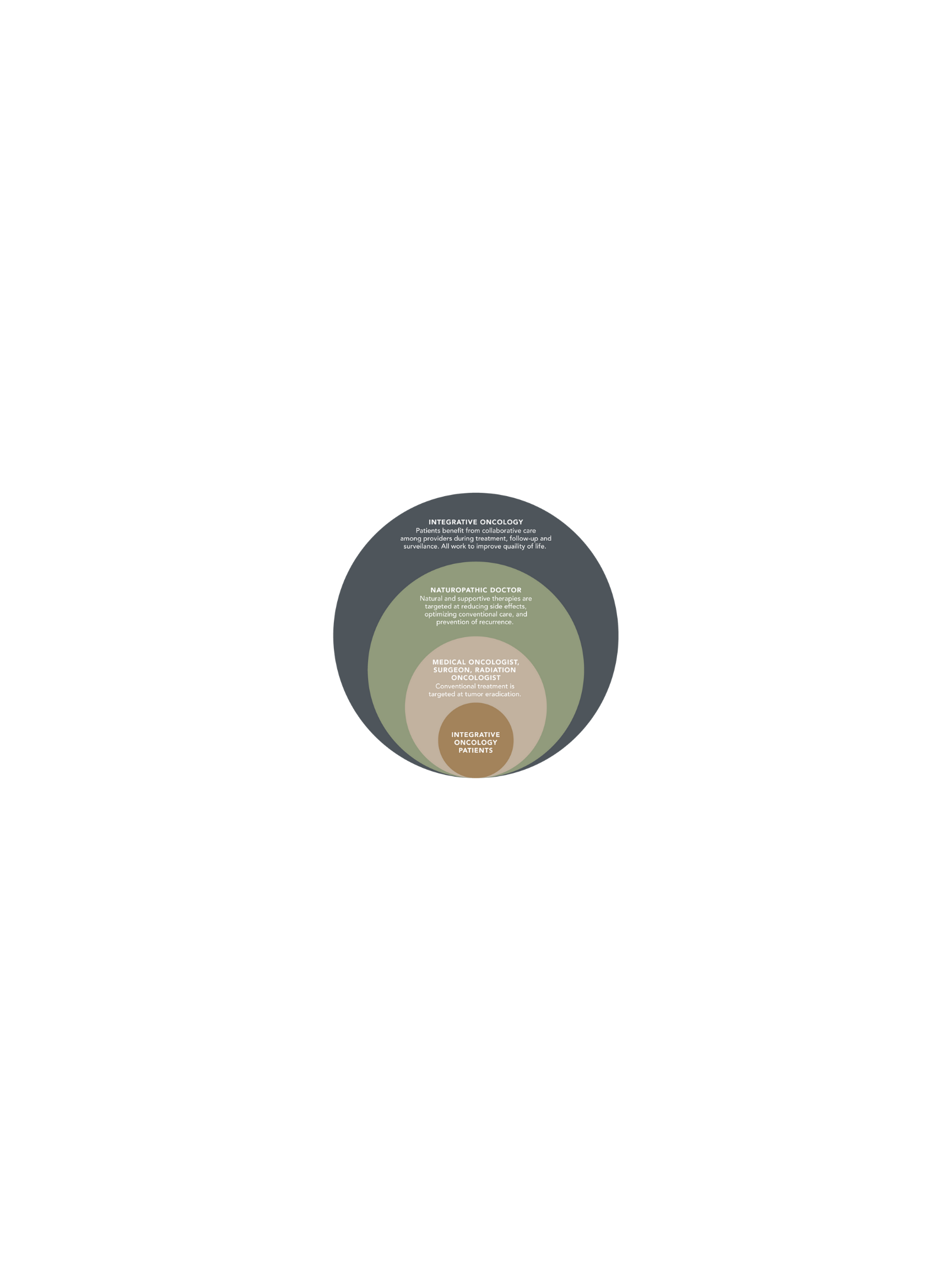 As the graphic shows, integrative oncology places the patient at the center of a collaborative care team—medical oncologists focus on tumour-targeted treatment, while naturopathic doctors offer supportive therapies that optimize quality of life and long-term health, and recurrence prevention.